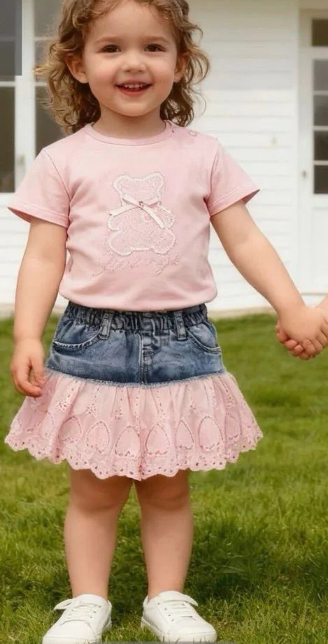 Super leuk setje met een tshirt met mooie steentjes erop. Rokje is mooi afgewerkt met kant
